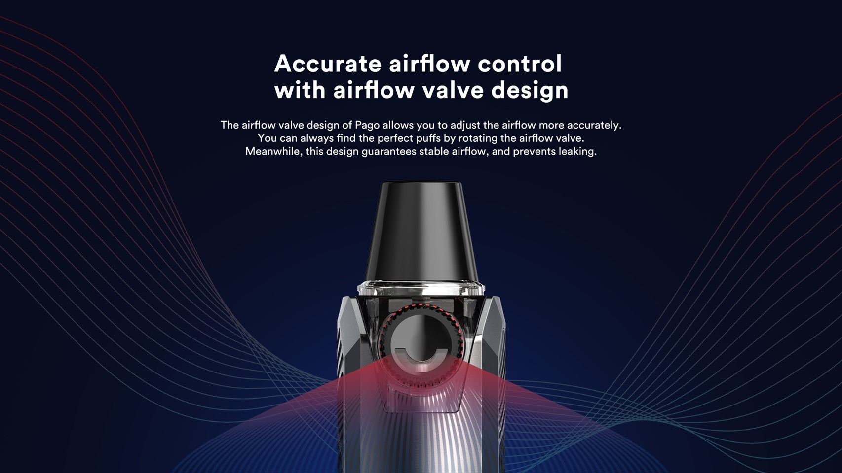 1.Pago的氣流閥設計讓您更精準地調節氣流。 2.透過旋轉氣流閥,您總能找到完美的泡芙。同時,這種設計確保了穩定的氣流,並防止洩漏。