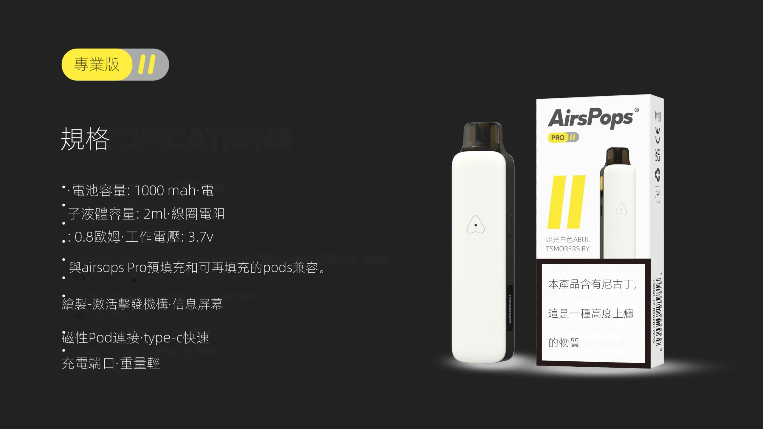 | 兼容性 | 所有 AirsPops Pro 煙彈(0.8Ω / 1.0Ω / 預填充煙彈) |