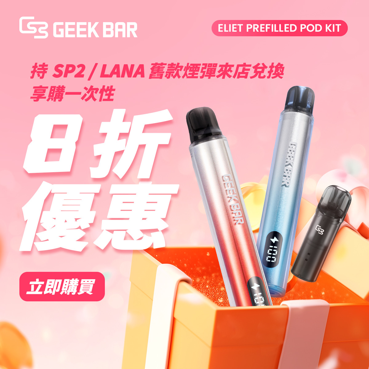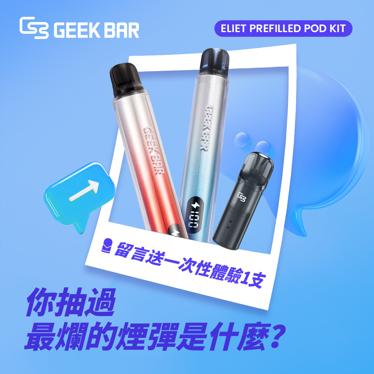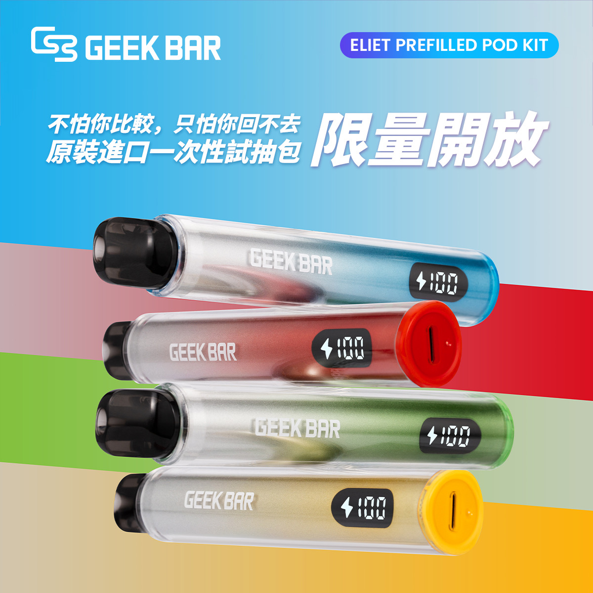 | Geek bar elite 菁英 | Midnight blue午夜藍主機, Green綠色主機, Yellow黃色主機, Aqua藍綠主機, Natural titanium鈦合金主機, Copper red銅紅主機, Cool gray冷灰主機, Kiwi Passion 奇異果百香果, Mellow Melon 三重蜜瓜, Watermelon Ice 冰西瓜, Summer Energy 夏季能量, Grape Ice 冰葡萄, Classic Tobacco 經典煙草, Mango Ice 冰芒果, Cool Menthol 清涼薄荷, Lemon Lime 檸檬青檸, Sour Pineapple Ice 酸甜鳳梨冰, Blueberry Ice藍莓冰, Cola lce冰可樂, 煙彈買三送一機! 限量送完為止勿下單 |
