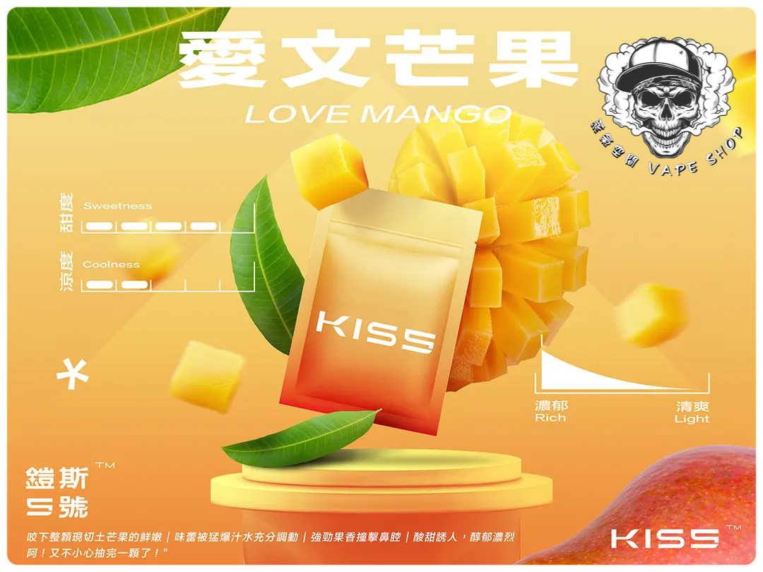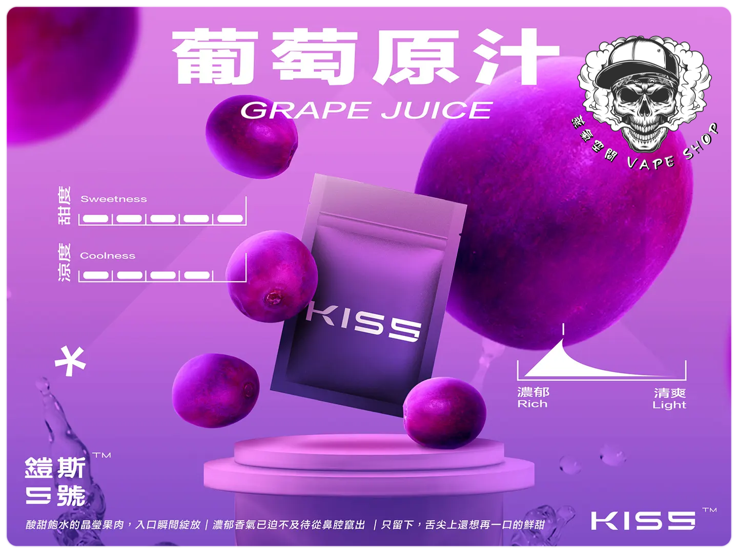 | KISS煙彈(3入) | 抹茶梅果, 藍莓泡泡糖, 百香雙響炮, 冷泡冰茶, 寶礦力水德, 鳳梨碎片, 超薄荷, 麥根沙士, 經典綠豆沙, 哈密瓜, 紅心芭樂, 海鹽檸檬, 葡萄原汁, 爆汁蜜桃, 愛文芒果, 加州蘋果, 蜜桃烏龍茶, 超級可樂, 珍珠奶茶, 冰鎮西瓜, 微醺櫻桃, 空煙彈 |