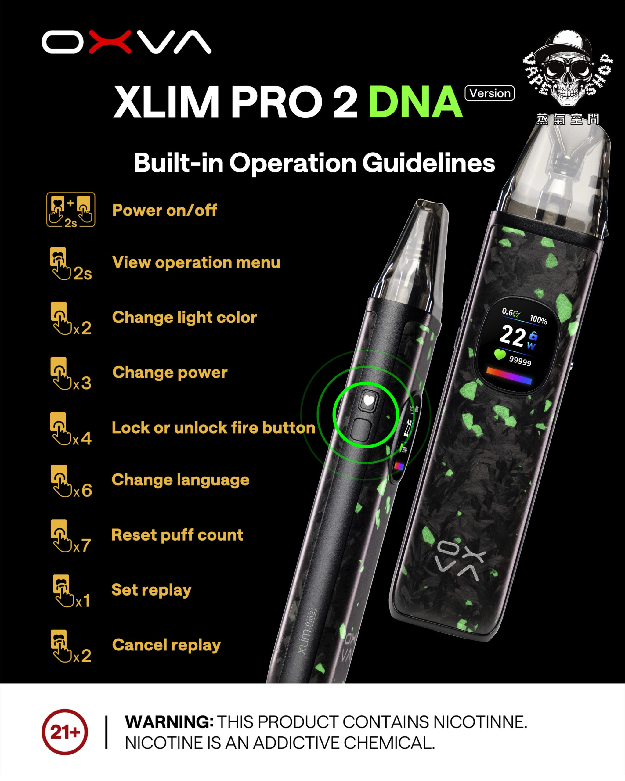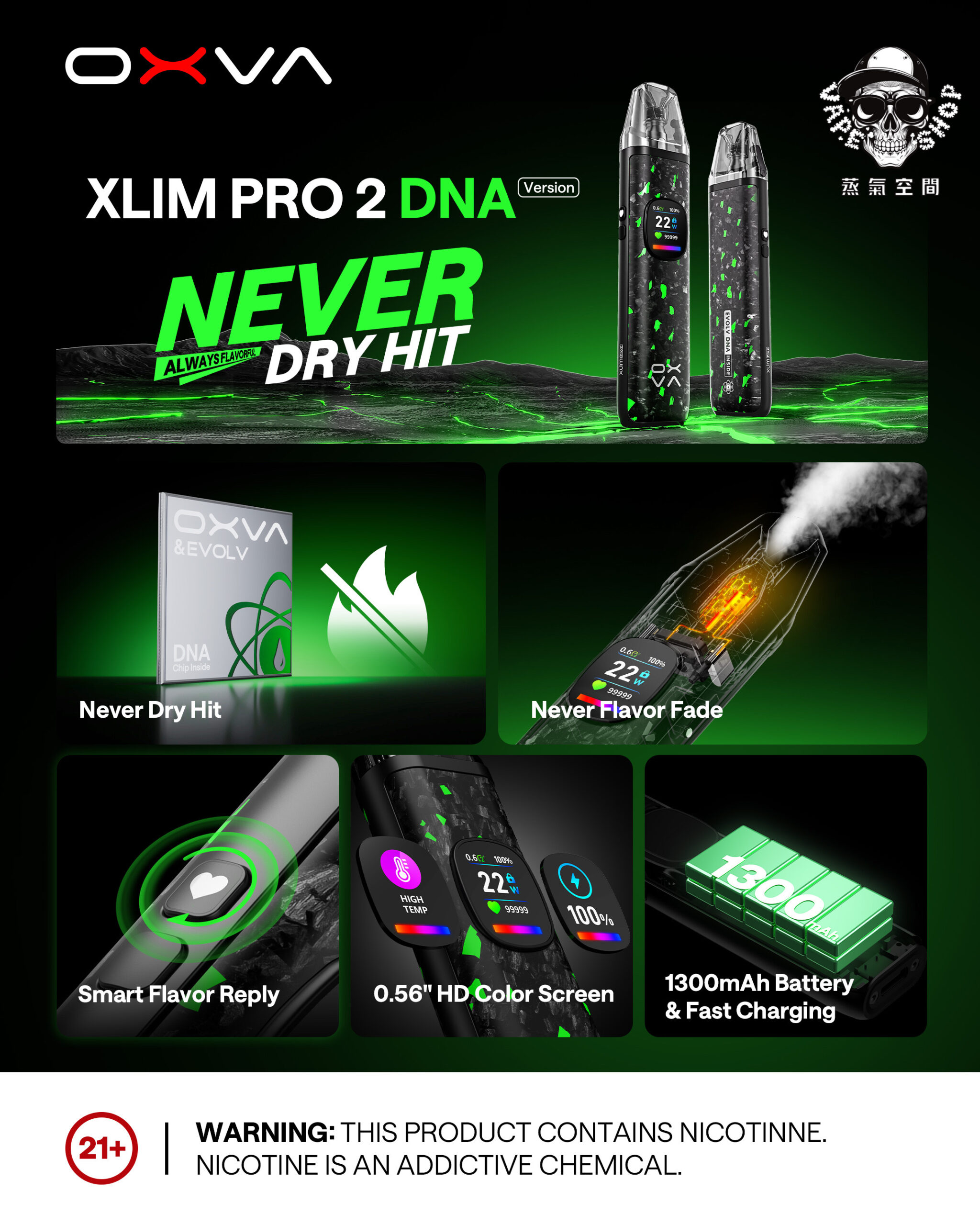 OXVA XLIM Pro 2 DNA,中文暱稱小蠻牛 DNA,是 XLIM 系列的旗艦級機型。首度搭載 Evolv DNA 晶片,支援 Replay 模式,結合 30W 調壓輸出、1300mAh 大電池與極致口感重現,是重度使用者與高端客戶的首選。