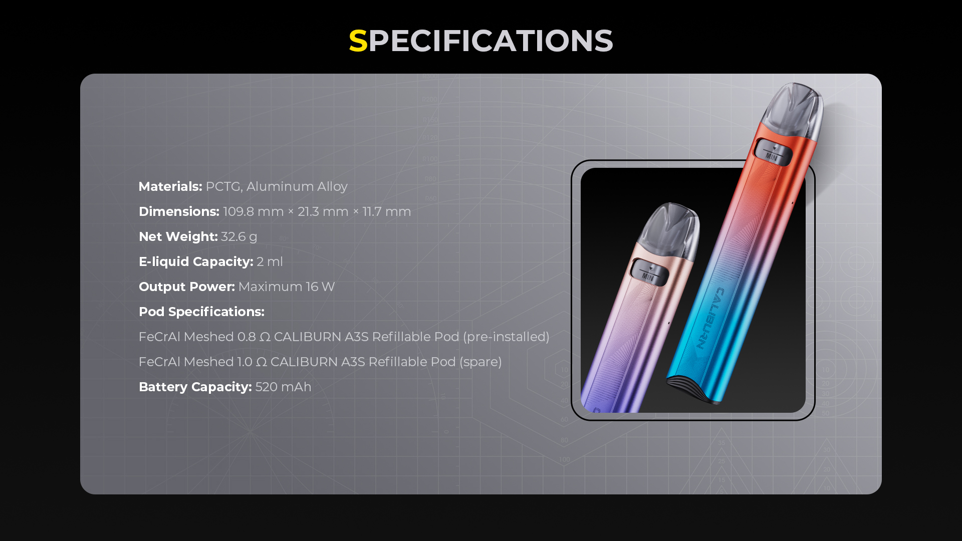 - 固定輸出功率:16W,提供穩定的吸食體驗。