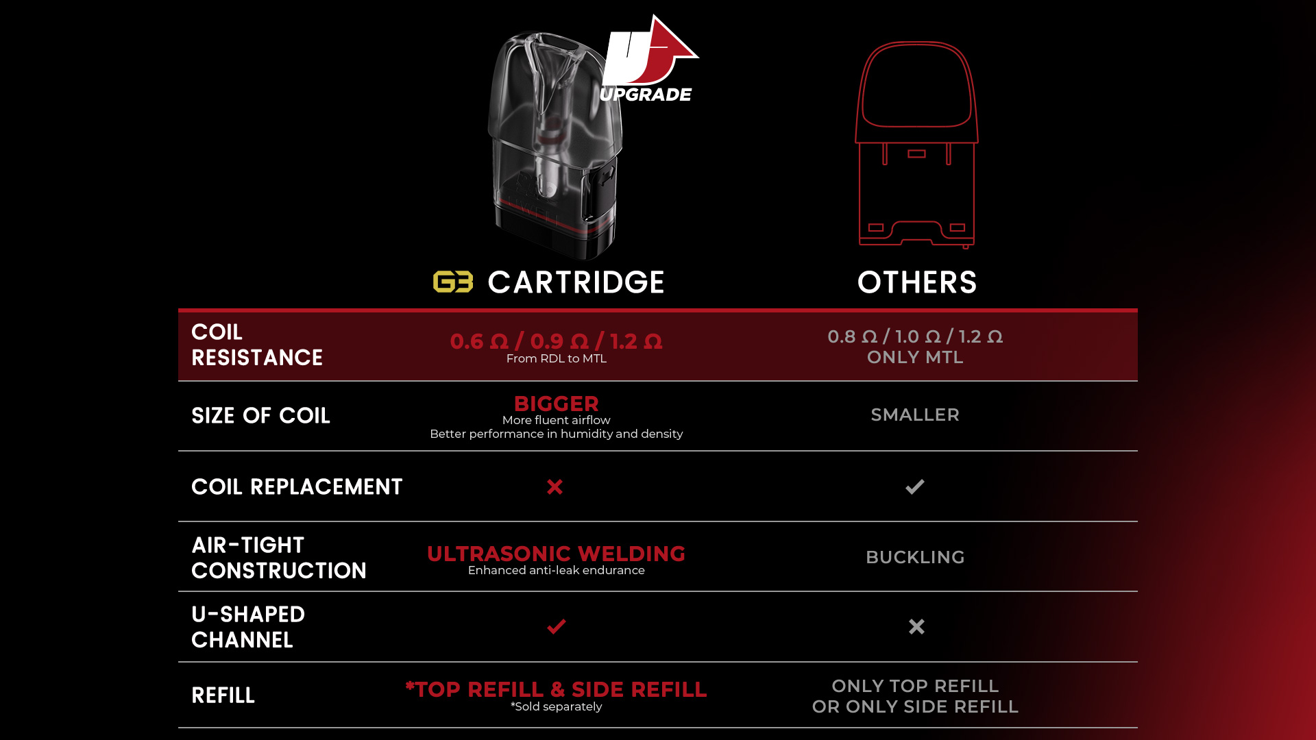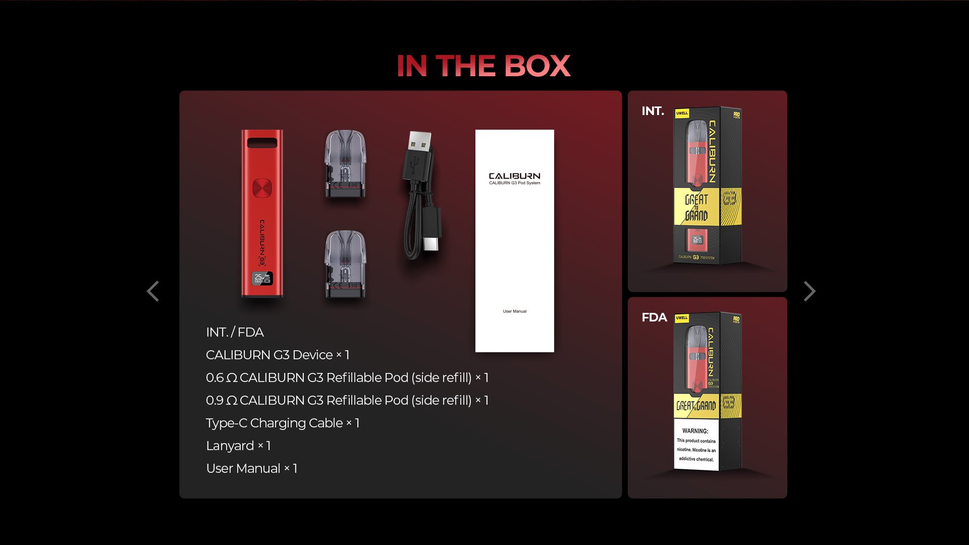| UWELL G3 咖哩棒 | 亮藍色套裝, 紅色套裝, 黑色套裝, 銀色套裝, 黑金套裝, 午夜藍套裝, 軍綠色套裝, 粉色套裝, 淺綠套裝, 灰色套裝, 0.4歐姆空煙彈(4人), 0.6歐姆空煙彈(4人), 0.9歐姆空煙彈(4人) |