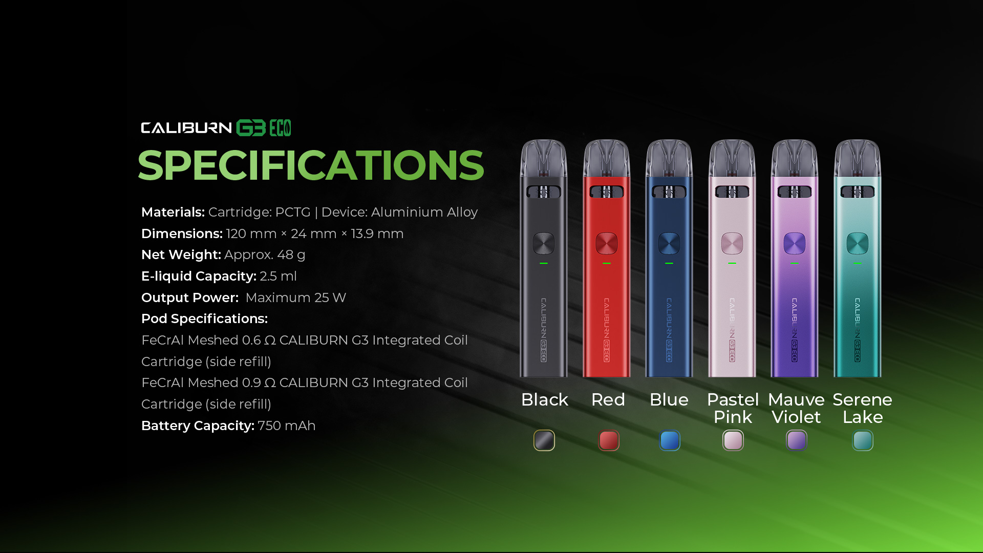 - 多樣化的線圈選擇: Caliburn G3 提供 0.6Ω、0.9Ω 和 1.2Ω 的線圈選項,滿足不同的吸食偏好。