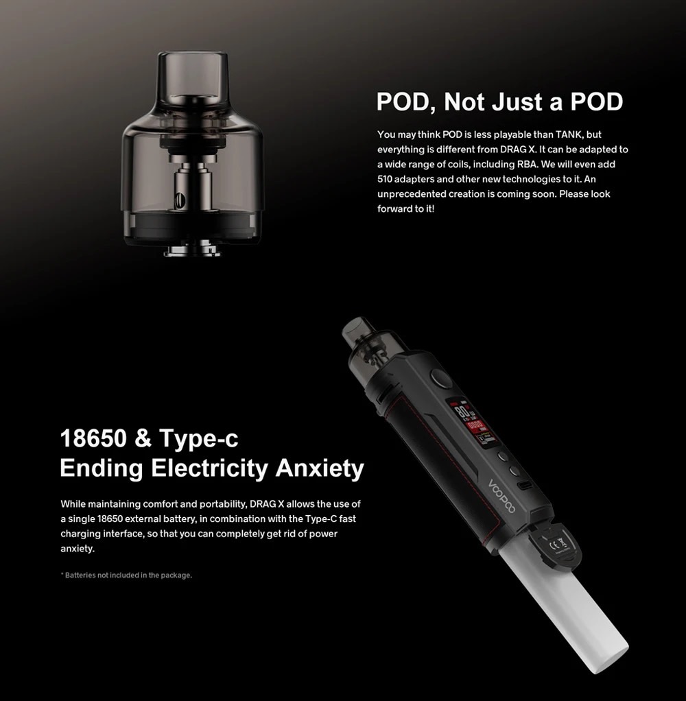 在保持舒適性和便攜性的同時,DRAG X允許使用單節18650外接電池,配合Type-C快充接口,讓你徹底擺脫電量焦慮。