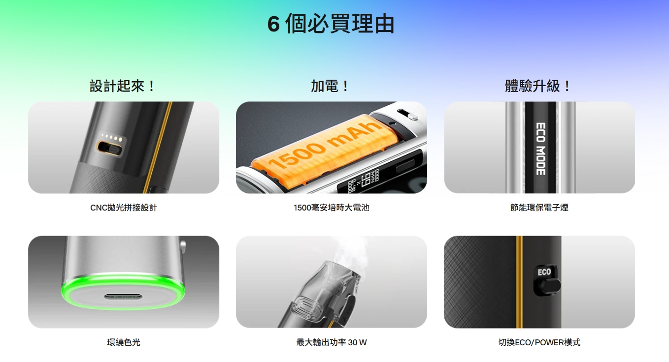 1500 mAh × OLED 側顯 × ECO/POWER 雙模式 × 頂部防漏艙